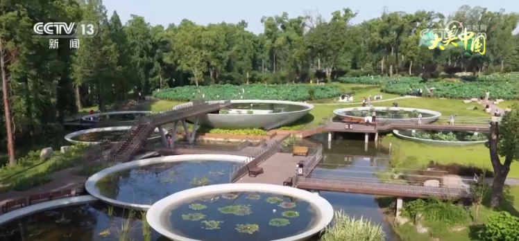 这片连绵的“荷塘”其实是由许多圆形的大水缸和方形的小水池凑在一块儿组成的,在这一区域里共有708个水池和3000多个水缸,而1200多个不同种的荷花就分散错落地“住”在这些“小单间”里。在一旁的“荷园撷英”区,8个碗型种植池有序地排列着,睡莲、菖蒲、芦苇等水生植物在其中高低错落,更有5株叶盘直径超过了1.5米的王莲正在含苞待放。